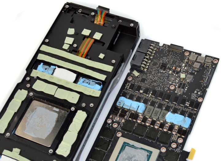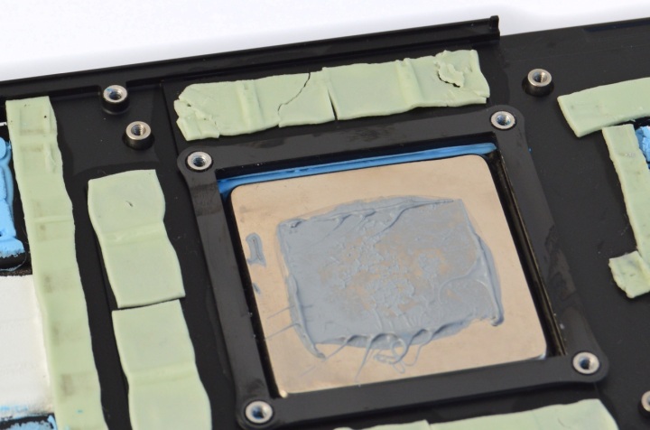 Используются разные термоинтерфейсы. В основном задействованы зеленоватые термопрокладки. Они обеспечивают контакт с микросхемами памяти, транзисторами и танталовыми конденсаторами. Для дросселей используется вязкое синее вещество, но для центральных элементов задействована белая термопрокладка.