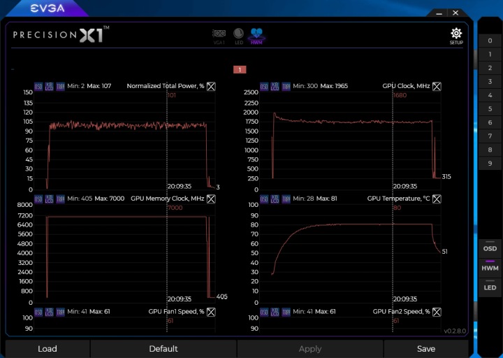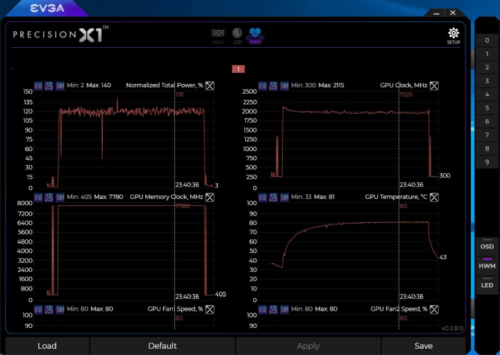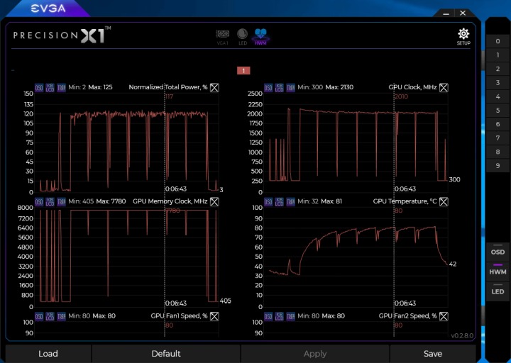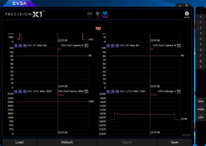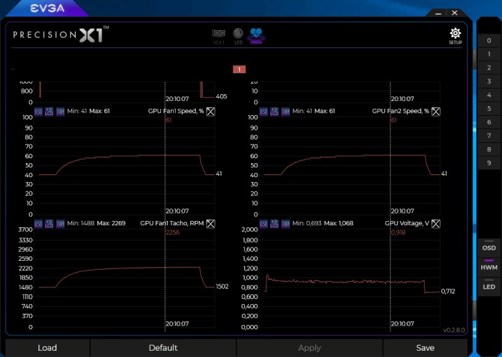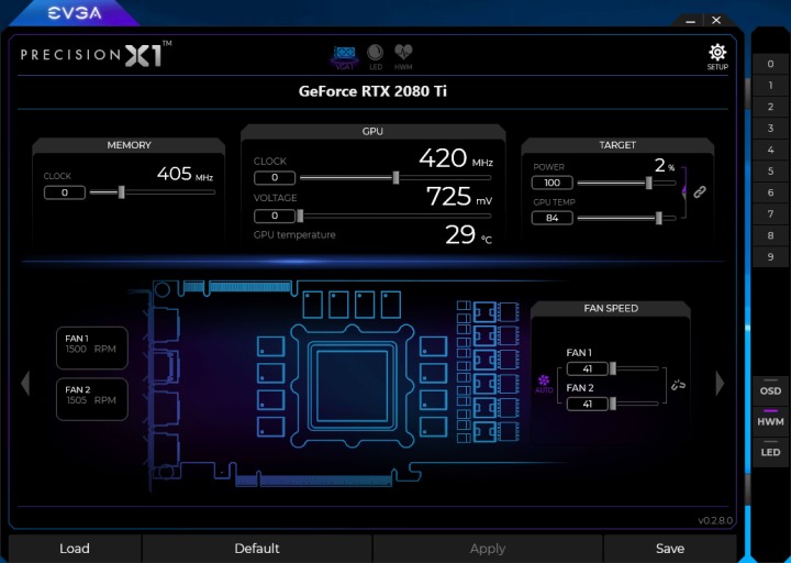 Для мониторинга и разгона использовалась утилита EVGA Precision X1. В ней доступна функция раздельного управления вентиляторами, настройка подсветки и поддерживается NVIDIA Scanner для определения оптимального разгона.
