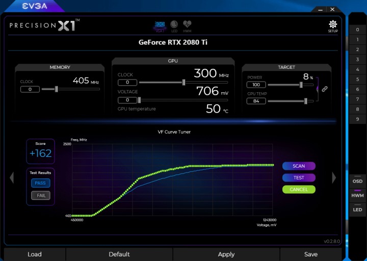 Проведя тестирование в NVIDIA Scanner, получили +162 МГц, но в итоге задействовали разгон ядра на 170 МГц.