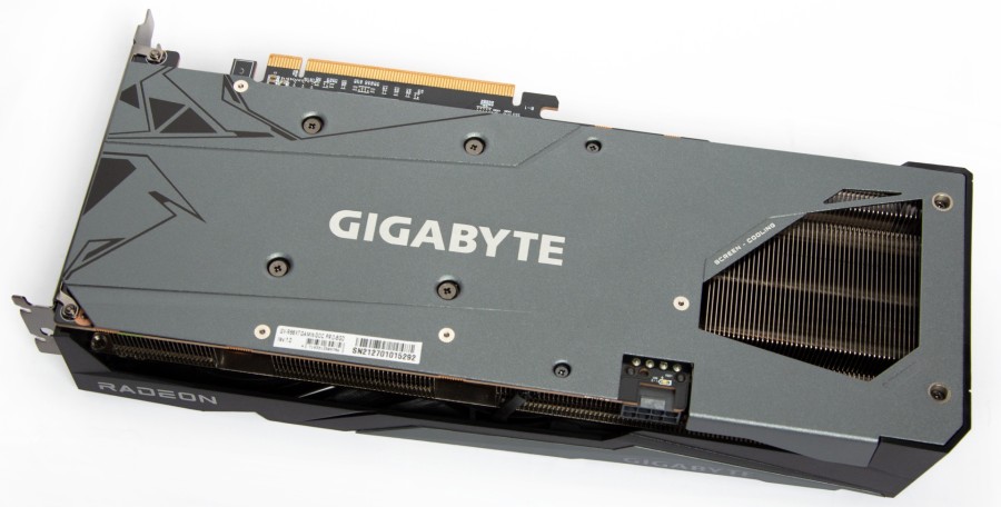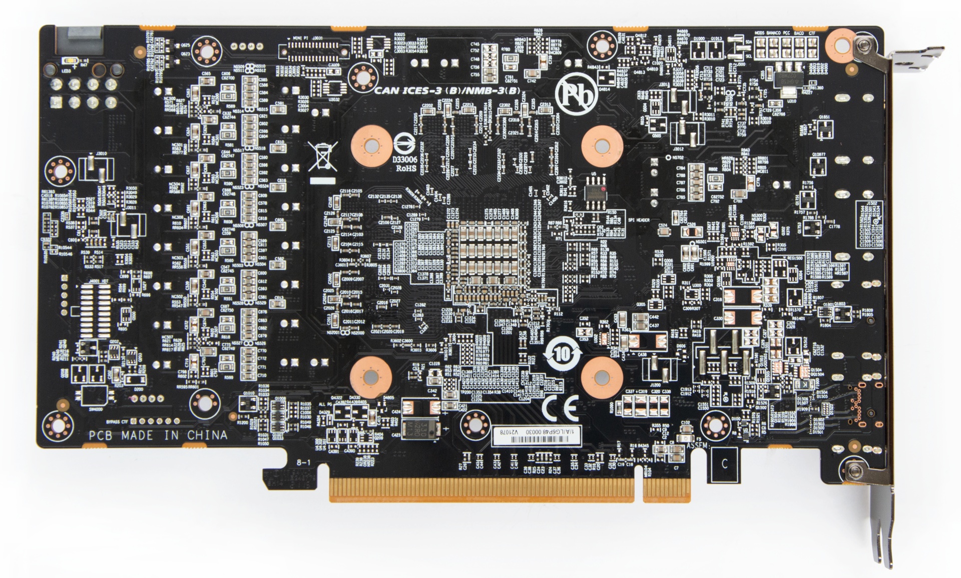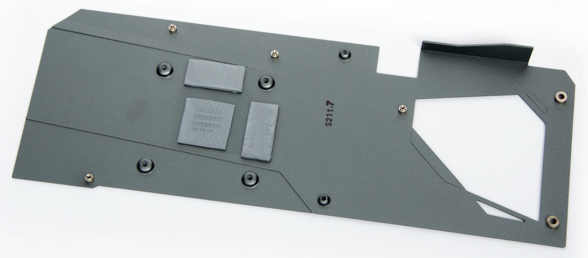 Обратная сторона видеокарты накрыта металлической пластиной. Поскольку плата короче кулера, сбоку есть пустое место, над которым расположен большой вырез. Такое «окно» уменьшает сопротивление направленному воздушному потоку, который формируется корпусными вентиляторами внутри ПК.
