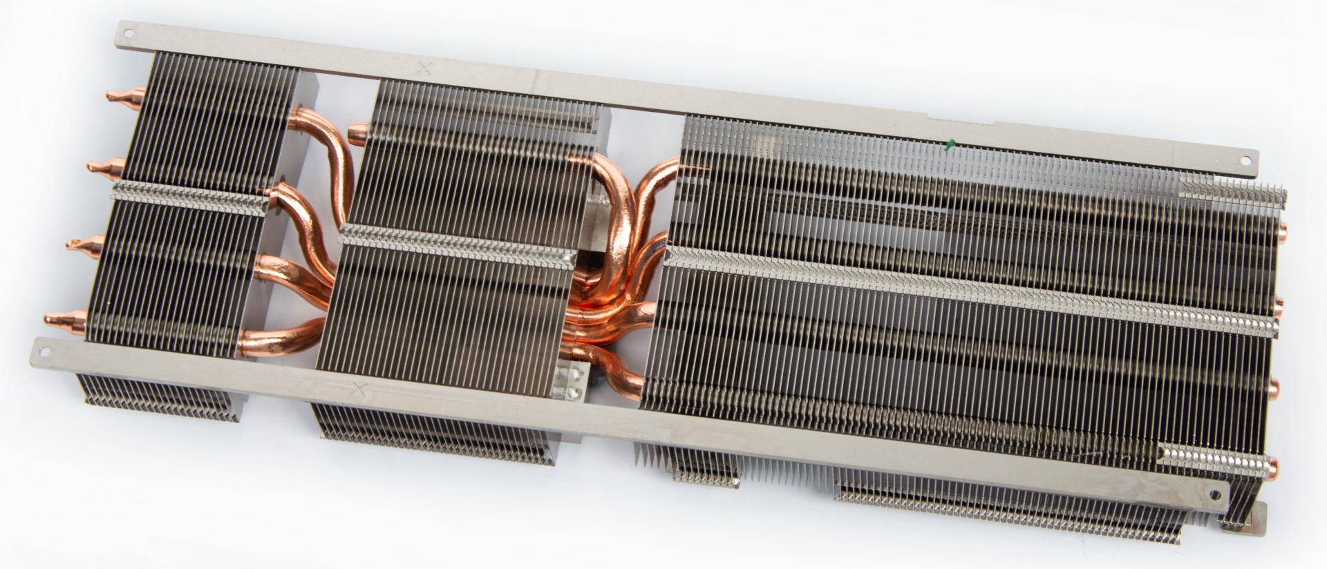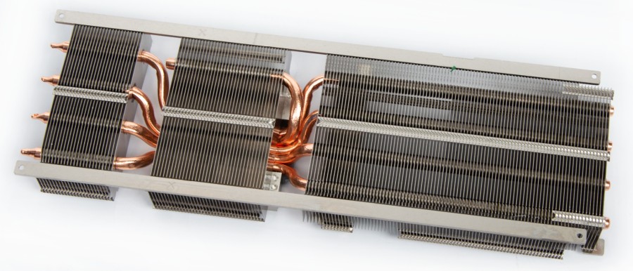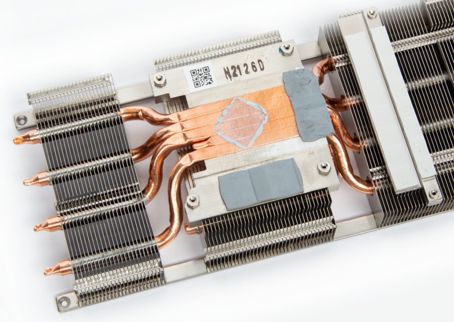 По отпечатку видно, что трубки полностью накрывают поверхность кристалла. Две термопрокладки на основании отводят тепло от микросхем памяти. У самой большой секции пластин предусмотрены контактные площадки для отвода тепла от элементов питающей цепи.
