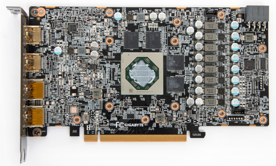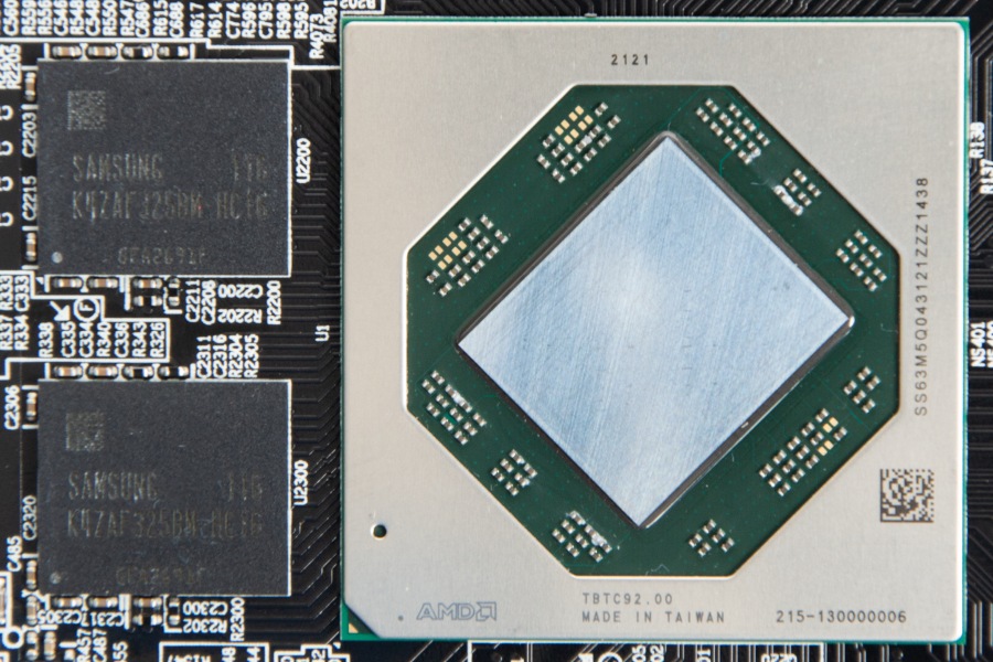 Процессор Navi 23 расположен на подложке под углом в 45°. Распаяны стандартные микросхемы памяти Samsung K4ZAF325BM-HC16.