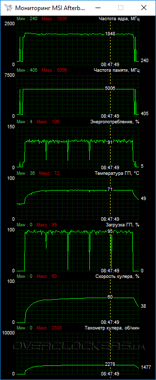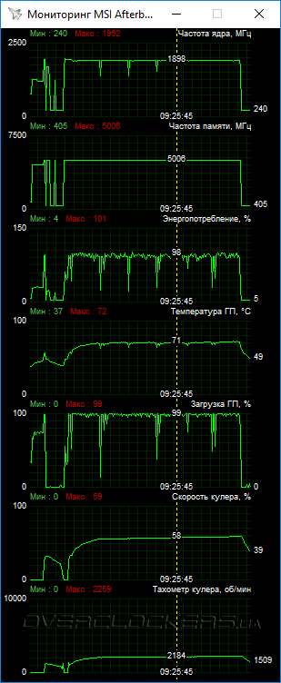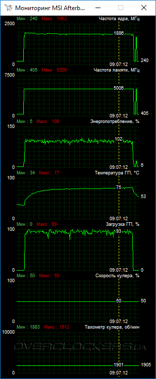 Мы для иллюстрации состояния видеокарты прибегнем к привычным скриншотам из MSI Afterburner. При начальных частотах кратковременные пиковые значения Boost могли достигать 1960 МГц. Во время тестирования в Tom Clancy's The Division реальная частота была близка к уровню 1900 МГц. В Metro: Last Light частота Boost была немного ниже, с периодическими просадками до уровня 1823–1835 МГц.
