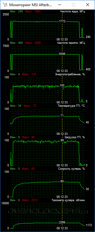 Результат хороший. Пиковое значение температуры не превысило 77 °C, что все еще ниже уровня нагрева референса. Так что, если в плане шума видеокарта не удовлетворит вас изначально, то при ручных настройках вы достигнете нужного компромисса.