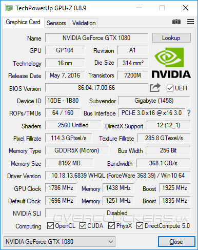 - драйвер GeForce GTX 1080: NVIDIA GeForce 368.25;