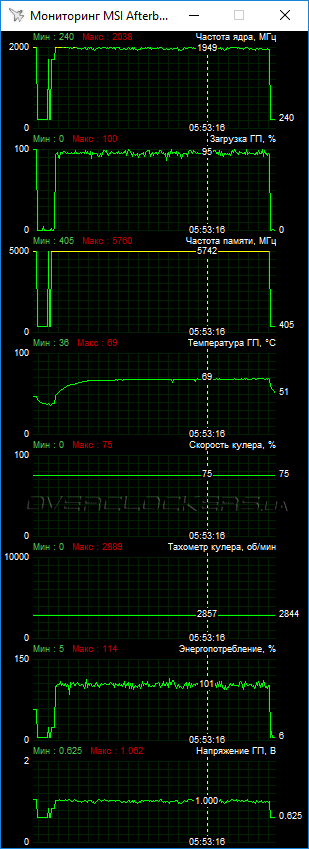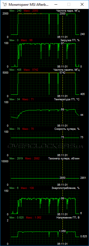 Для такого разгона пришлось выводить Gigabyte в шумный режим, чтобы улучшить охлаждение. Если не гнаться за максимумом по частоте GPU, а сделать акцент только разгоне памяти, то можно достичь какого-то сбалансированного режима при невысоком шуме и повышенной производительности.