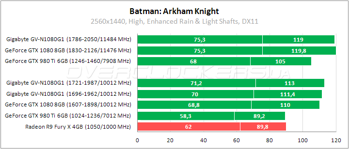 Заводской разгон обеспечивает Gigabyte скромное преимущество над референсом в Arkham Knight. В разгоне G1 Gaming и Founders Edition равны.