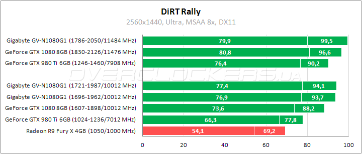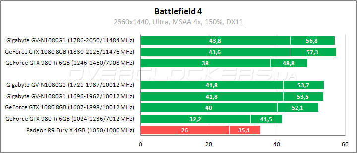 При начальных частотах Gigabyte примерно на 3–5% быстрее референса в Battlefield 4. При более высоких частотах 1721–1987/10012 МГц (OC Mode) итоговые показатели почти такие же. В разгоне обе версии GeForce GTX 1080 демонстрируют близкие показатели. Отрыв от Radeon R9 Fury X в этой игре огромный.