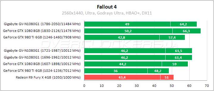При максимальном качестве всех параметров графики в Fallout 4 отставание Fury X от новичков меньше, чем в других играх. Но лидерство Radeon GTX 1080 все равно не вызывает сомнений. Заводской разгон обеспечивает Gigabyte преимущество менее 5% относительно референса, переключение к режиму OC Mode видимого выигрыша не дает. Ручной разгон обеспечивает ускорение около 5%. Разогнанный референс быстрее.