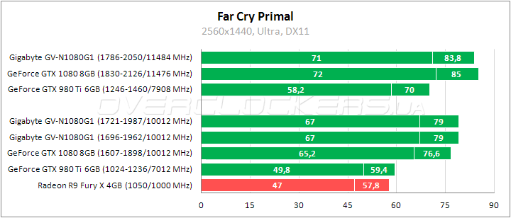 В Far Cry Primal у Gigabyte преимущество 3% над простым товарищем. Разницы между рабочими режимами (Gaming/OC) нет. Прирост от ручного разгона на уровне 6%.