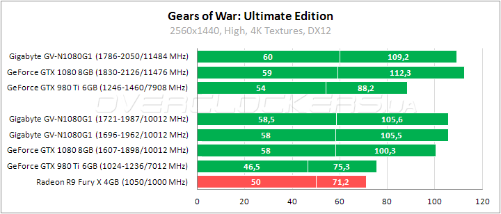 Повышенные частоты Gigabyte обеспечивают привычное преимущество в рамках 5%. Отрыв от GeForce GTX 980 Ti до 40% по среднему fps, отрыв от Radeon R9 Fury до 48% по среднему параметру. Разгон дает скромное ускорение. Минимальный fps почти не растет, похоже, он упирается в другие факторы производительности, не в мощность GPU.
