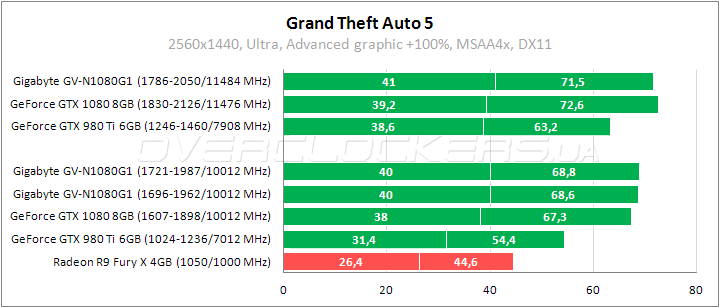 Внушительный отрыв от старого флагмана в GTA 5, разрыв с Radeon еще более серьезный. Референсный GeForce GTX 1080 и Gigabyte различаются примерно на 5% в номинале. В разгоне они близки, преимущество по минимальному fps связано, опять же, скорее всего, с новым видеодрайвером.