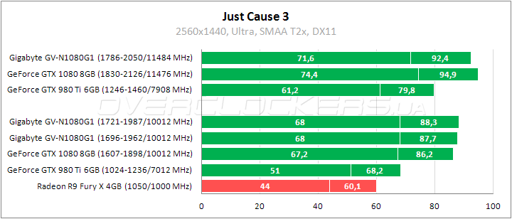 В Just Cause 3 повышенные частоты Gigabyte G1 Gaming обеспечивает преимущество в пару процентов относительно референса, а переключение к более быстрому режиму придает ускорение в доли процента. Отрыв от GeForce GTX 980 Ti более 30%, отрыв от Radeon R9 Fury X на уровне 45–55%.
