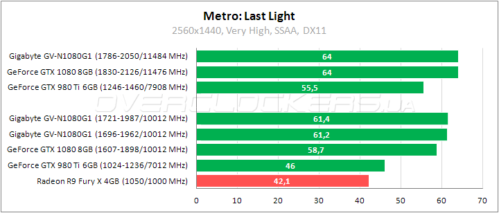 Около 4% выигрывает герой обзора в Last Light у простого напарника и 33% выигрывает у предшественника. Конкурент от AMD слабее на 45%. В разгоне оба варианта топового Pascal равны.