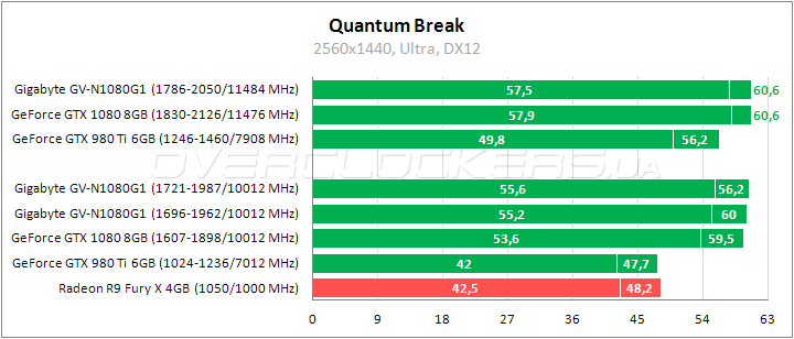 Еще одна игра под DirectX 12. Частота кадров в Quantum Break ограничена 60–61 fps. Поэтому в разгоне результаты у лидеров равны. Да и в номинале Gigabyte GV-N1080G1 GAMING-8GD выдает почти стабильные 60 fps, обеспечивая полный комфорт в игре.