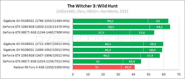 Новые флагманы легко выдают в The Witcher 3 выдают высокий fps при включенном Hairworks, на треть обгоняя старые решения. Менее 4% выигрывает Gigabyte G1 Gaming у референса с начальными частотами, переключение на более скоростной режим придает ускорение меньше 1%. Дальнейший разгон позволяет получить ускорение еще на 6%. Из-за более высоких частот после разгона референс выигрывает пару процентов.