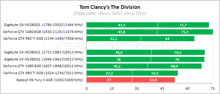 GeForce GTX 1080 быстрее GeForce GTX 980 Ti в The Division на 26–33%, отрыв от Radeon R9 Fury X на уровне 30–34%. Повышенные частоты у G1 Gaming обеспечивают скромное преимущество в несколько процентов, разгон позволяет выиграть относительно рекомендованных частот до 16% по минимальному fps, по среднеигровому показателю изменения небольшие.