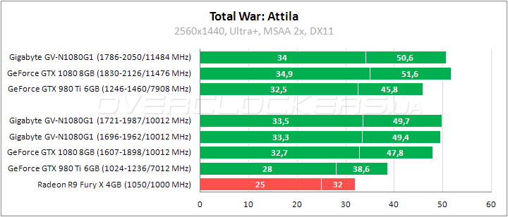 В Attila отрыв нового флагмана от старого не столь велик, как в других играх. Но изначально GeForce GTX 1080 чуть быстрее GeForce GTX 980 Ti с разгоном. Заводские частоты обеспечивают герою обзора дополнительное преимущество около 3% по среднему fps. переключение к частотам 1721–1987/10012 МГц дает едва заметное изменение итоговых результатов. Прирост от разгона тоже лишь несколько процентов.
