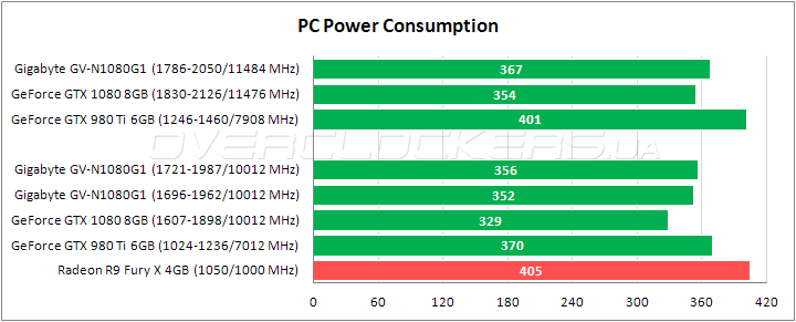 Система с видеокартой G1 Gaming потребляет больше системы с обычной картой этой серии, что вполне ожидаемо, ведь рабочие частоты выше. В разгоне показания тоже немного выше относительно референса, но все еще ниже уровня потребления GeForce GTX 980 Ti. Касательно показаний Radeon нужно сделать пояснение, что это разогнанный R9 Nano, и это может быть причиной высоких итоговых значений. По первым тестам энергопотребление стандартного Fury X и GeForce GTX 980 Ti примерно на одном уровне.