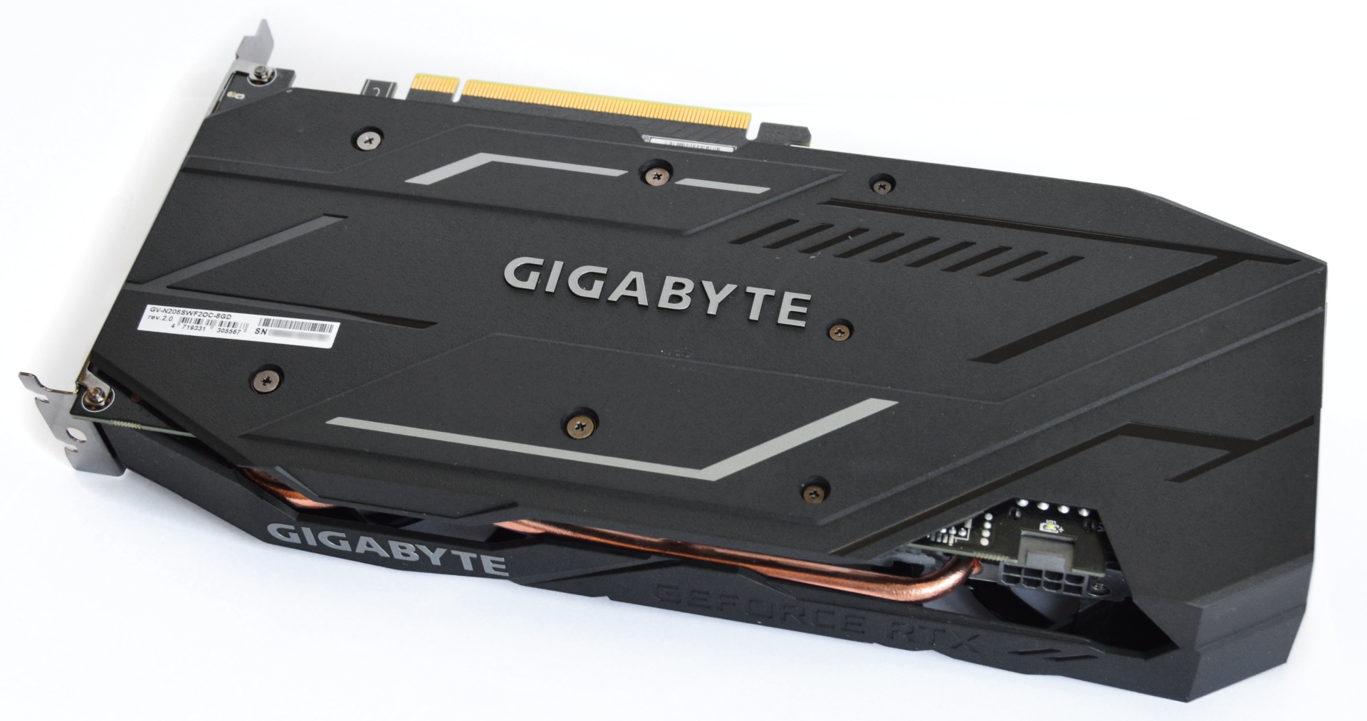 Нельзя не отметить схожесть Gigabyte GV-N206SWF2OC-8GD и Gigabyte GV-N1060WF2OC-6GD. Новая видеокарта массивнее, что объясняется более крупными габаритами системы охлаждения. Но есть явная конструктивная преемственность, которая выражается в ключевых особенностях системы охлаждения и в наличии пластикового бэкплейта. Конструкция использует две тонкие тепловые трубки с прямым контактом.