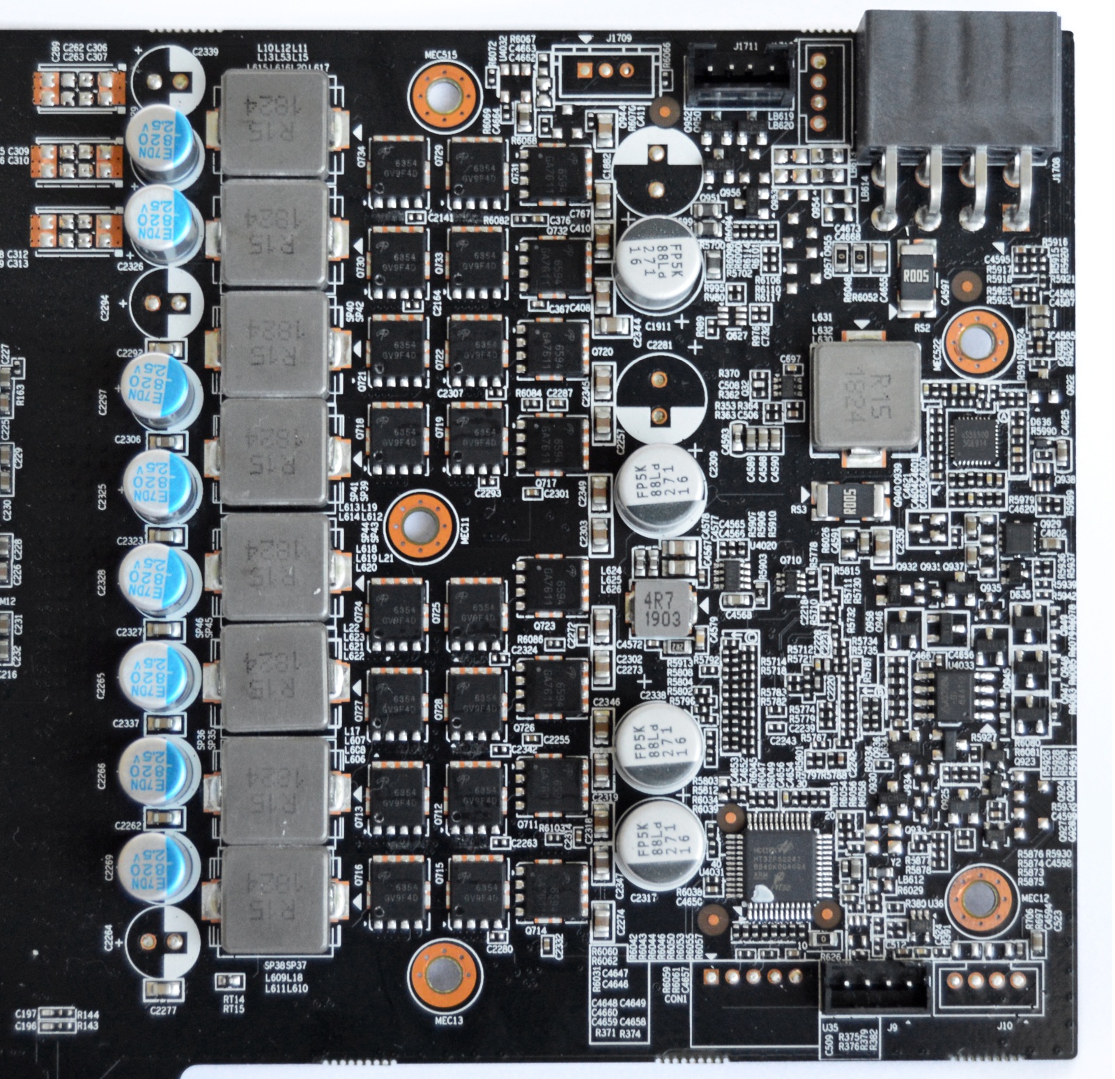 Половину платы занимает система питания GPU, насчитывающая восемь фаз.