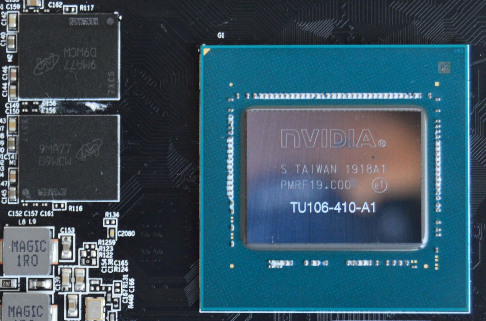 Процессор TU116-410-A1 оперирует 2176 потоковыми процессорами CUDA, 136 текстурными блоками, 272 тензорными ядрами и 32 ядрами RT. Восемь гигабайт памяти набрано микросхемами Micron с маркировкой 9MA77 D9WCW.