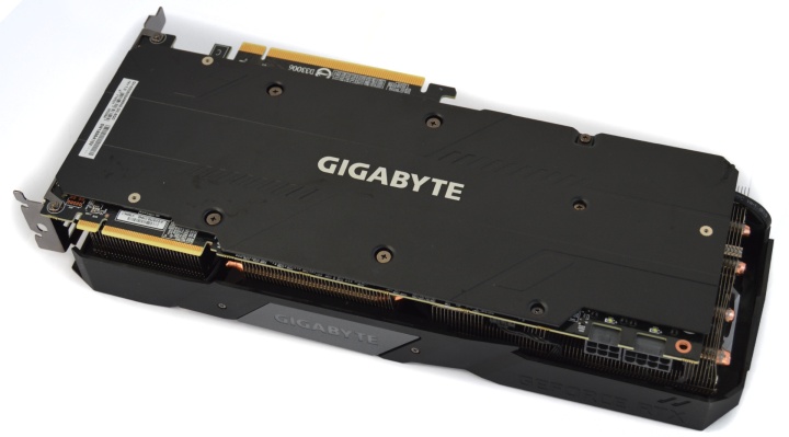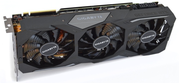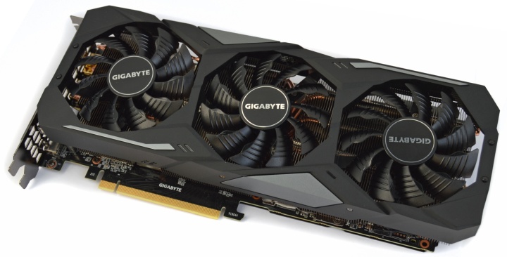 Перед нами крупная видеокарта длиной около 29 см. В охлаждении используется три вентилятора, что давно стало стандартном для топовых моделей Gigabyte. Внешне напоминает GV-N1080G1 GAMING-8GD, но с небольшими изменениями в дизайне корпуса.