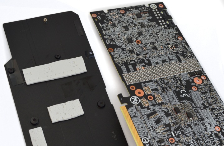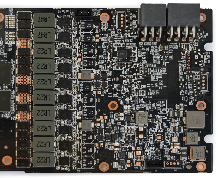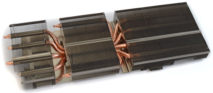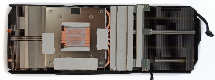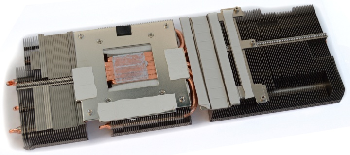 Массивный радиатор состоит из трех секций пластин, пронизанных тепловыми трубками. Крупная квадратная пластина в основании накрывает микросхемы памяти. На боковой секции есть площадки для отвода тепла от всех элементов узла питания. Через термопрокладки обеспечивается контакт с транзисторами, дросселями и конденсаторами.
