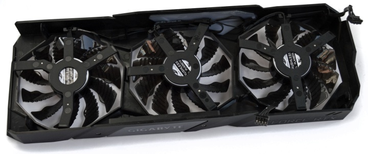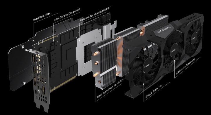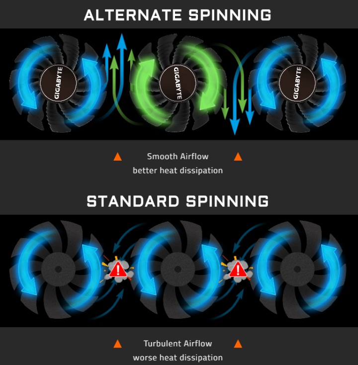 Также вентиляторы Gigabyte вращаются в разных направлениях, создавая единый направленный поток воздуха по краям. Это позволяет избежать небольших зон турбулентности при синхронном однонаправленном вращении.