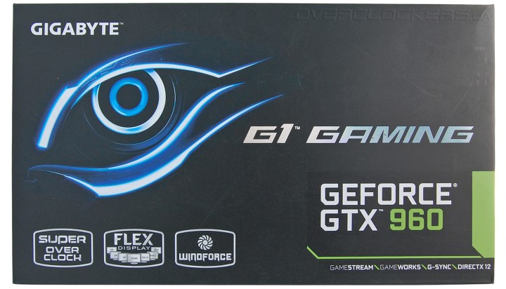 Охлаждение накрыто кожухом замысловатой формы с множеством прорезей. Сбоку есть большой логотип WindForce с голубой подсветкой. При осмотре обращает на себя внимание наличие двух шестиконтактных разъемов питания вместо одного, как у обычных GeForce GTX 960.