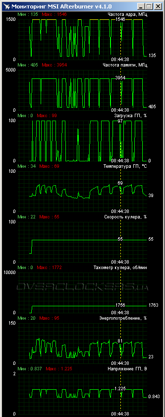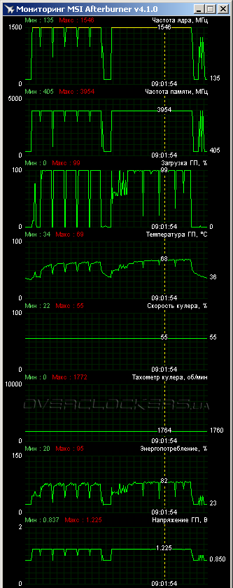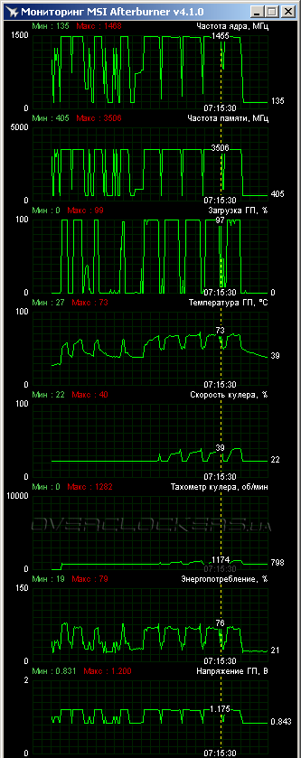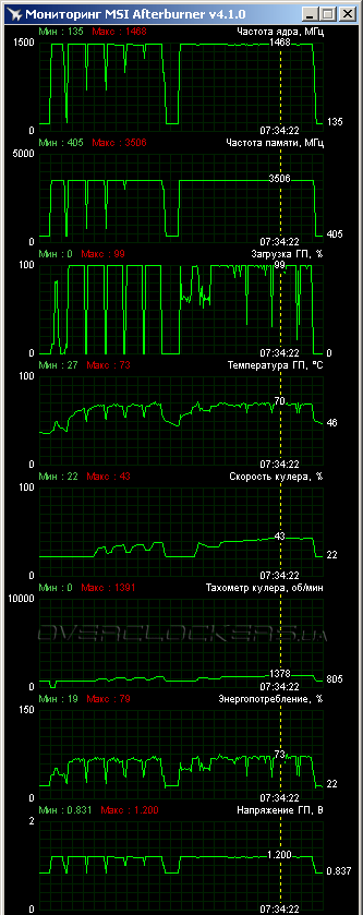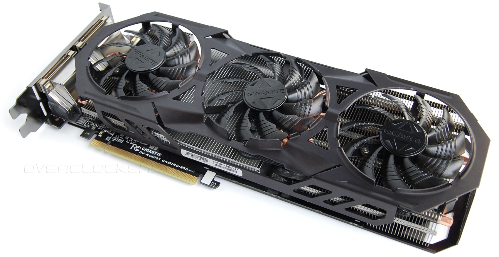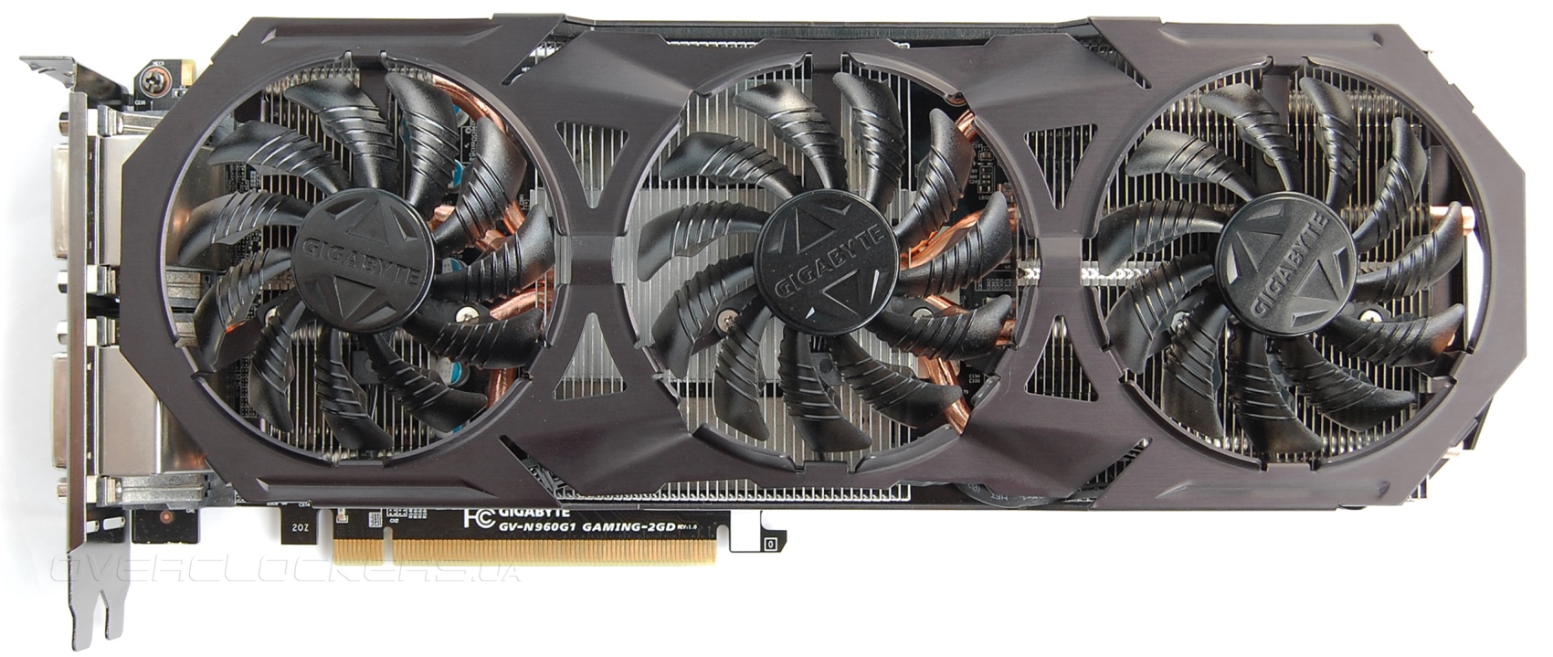 Реальная частота Boost достигает пиковых значений 1455–1468 МГц, что является рекордом. Максимум, что мы видели на лучших топовых версиях GeForce GTX 960 других производителей — 1430 МГц. При игровой нагрузке температура ядра не превышала 73 °C при 24 °C в помещении. Скорость вращения вентиляторов варьировалась в диапазоне 1200–1390 об/мин, в таком режиме они очень тихие. Нужно отметить, что упомянутый выше собрат GV-N960WF2OC-2GD был немного холоднее при меньших оборотах и меньшей температуре окружающей среды. То есть реальная эффективность систем охлаждения примерно на одном уровне. При этом младшая версия оснащается кулером с тремя тепловыми трубками и двумя вентиляторами 92 мм.