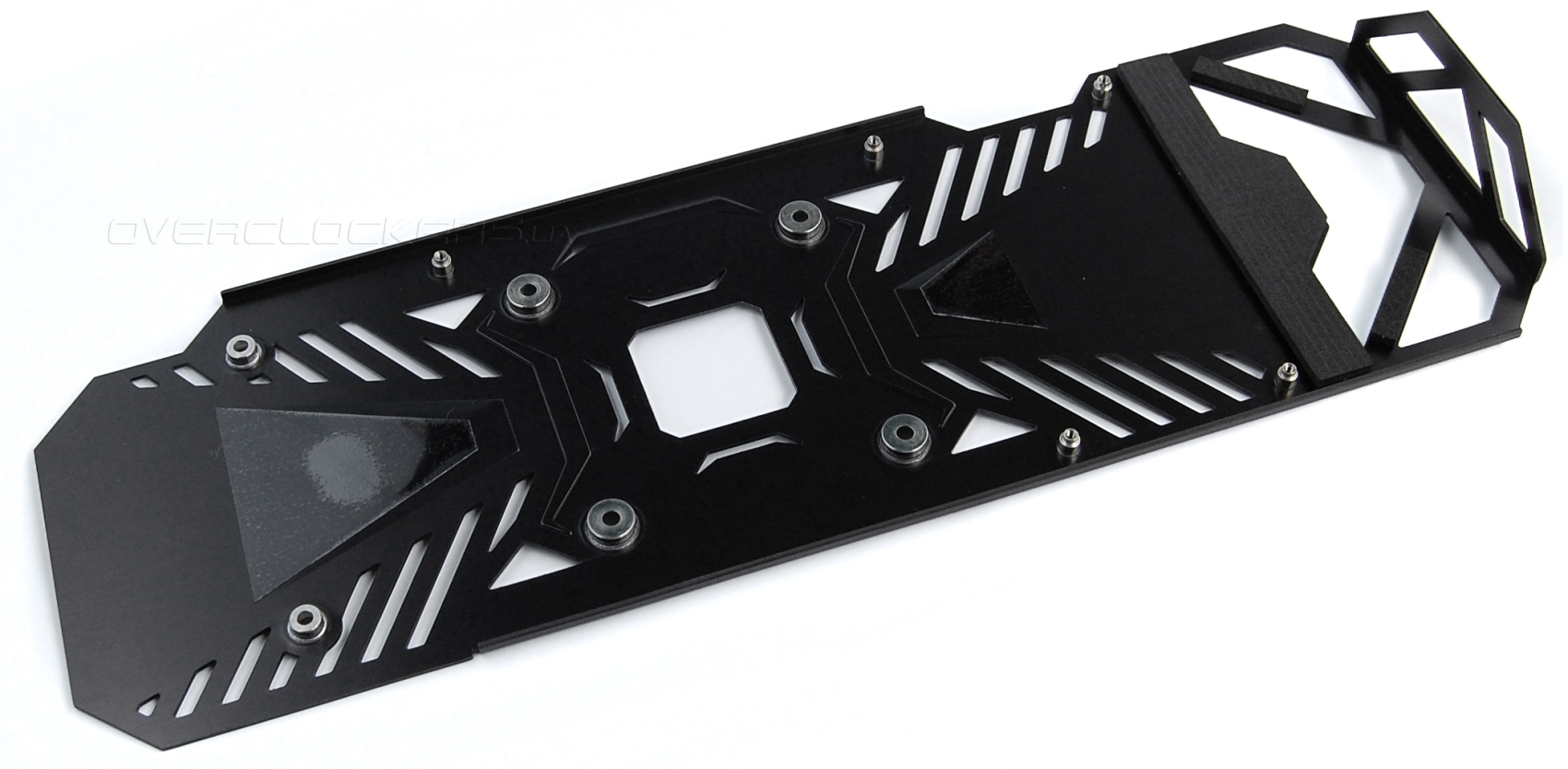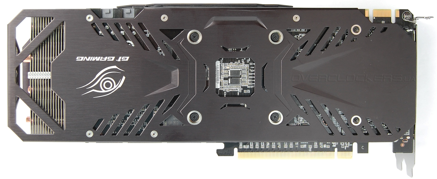 Задняя сторона накрыта металлической пластиной, вырезы которой образуют свой узор, вписывающийся в общий дизайн. Видно, что плата по размерам меньше охлаждения. Боковая часть задней пластины с большими прорезями нависает над пустотой и частью радиатора. Разъемы питания развернуты защелками вверх, что упрощает подключение соответствующих кабелей.