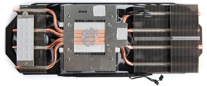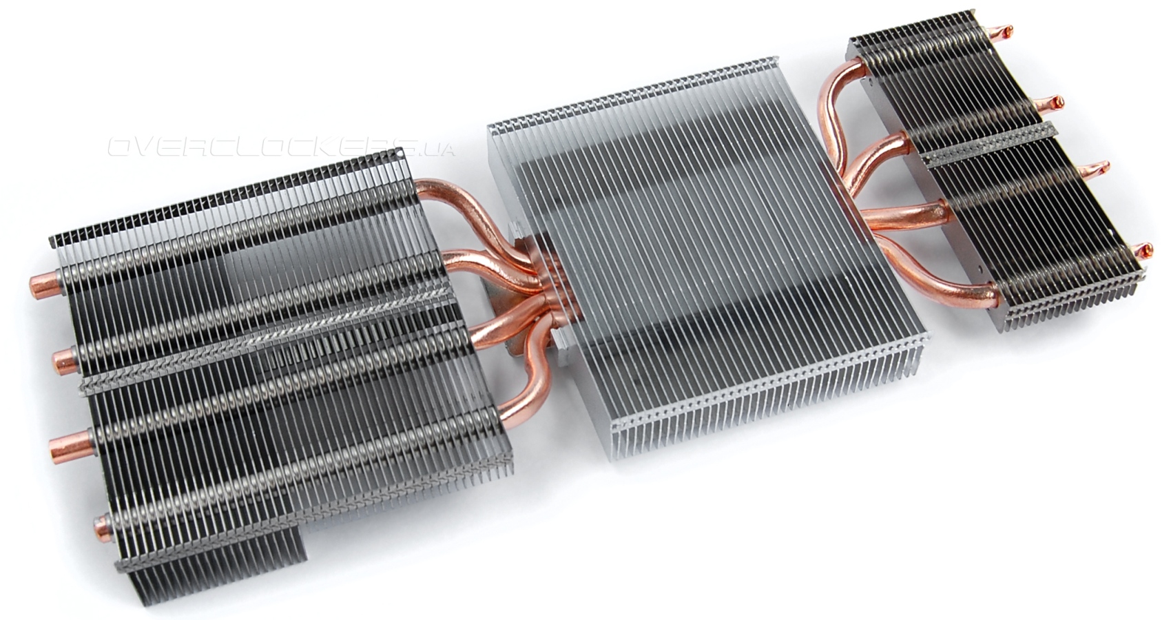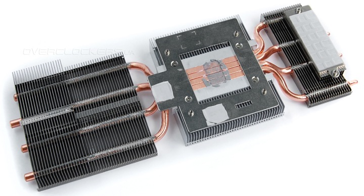 Взглянем ближе на охлаждение. Крупный радиатор состоит из трех секций алюминиевых пластин, нанизанных на четыре тепловые трубки. Центральная, самая массивная часть, установлена на алюминиевое основание, которое контактирует с микросхемами памяти. Зона контакта с графическим ядром открыта, реализован прямой контакт тепловых трубок с поверхностью кристалла.
