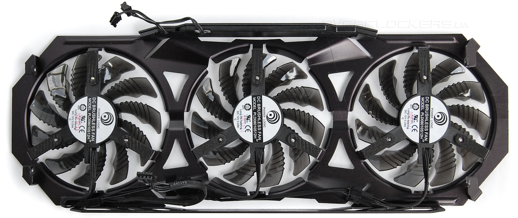 Кожух несет на себе три вентилятора Power Logic PLD08010S12H типоразмера 80 мм. Лопасти имеют особую форму с бороздами на внешней поверхности и дополнительными треугольными «зубцами». Такая форма крыльчатки улучшает характеристики вентиляторов и мощность создаваемого воздушного потока.