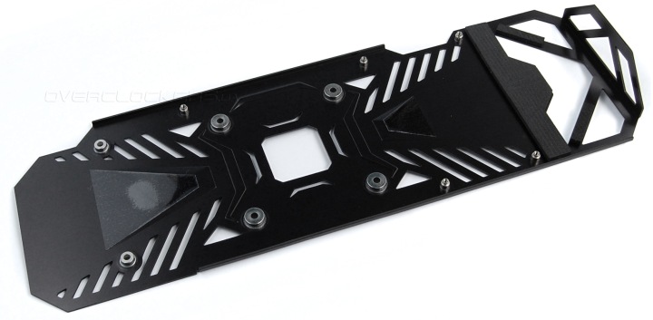 Пластина с обратной стороны платы не отводит тепло от каких-либо элементов. Хотя под ней расположено пара микросхем памяти. Пластина придает жесткости всей массивной конструкции и защищает от внешних воздействий.
