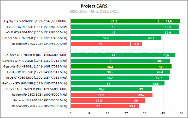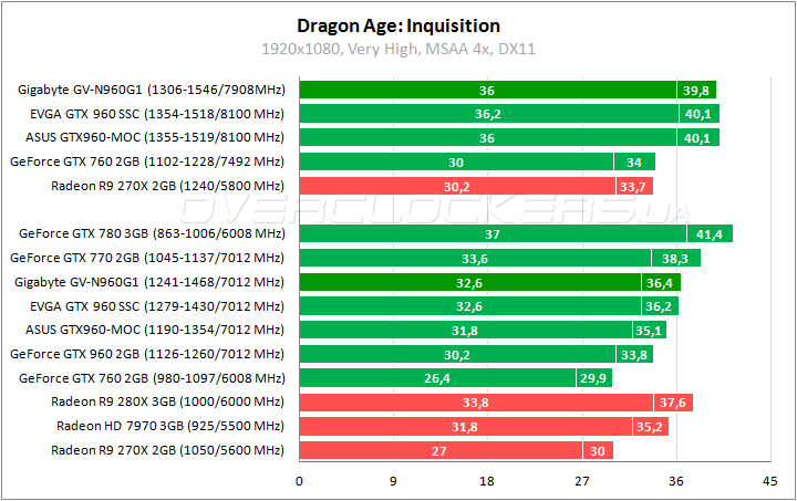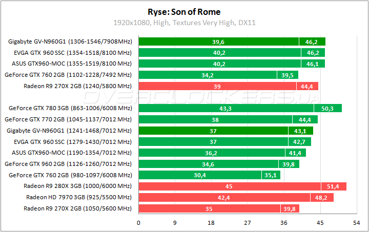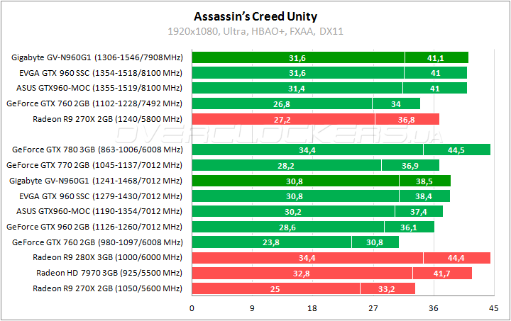 В последней игре серии Assassin’s Creed результаты Gigabyte в номинале слабо отличаются от видеоадаптеров GeForce GTX 960 с меньшим заводским разгоном. В разгоне у всех представителей серии практически одинаковые показатели. Разгон минимизирует отставание от Radeon HD 7970.