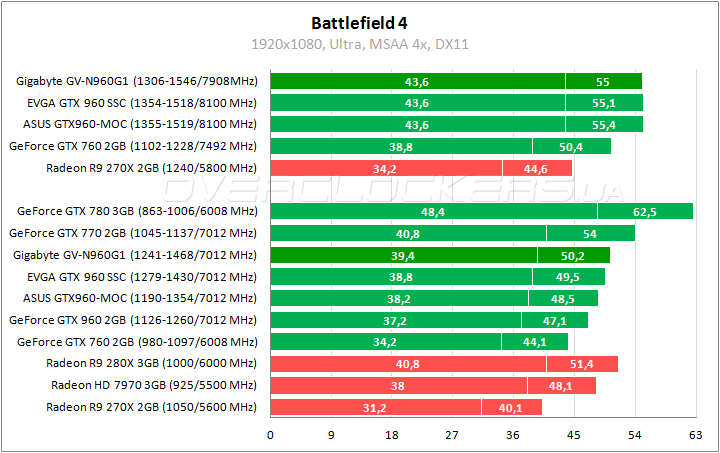 Gigabyte лучше референсной серии на 7% в Battlefield 4. Минимальное отставание от Radeon R9 280X на уровне 2–3%, отставание от GeForce GTX 770 около 4–8%. Прирост от разгона 10%. Результаты форсированных GeForce GTX 960 одинаковы.