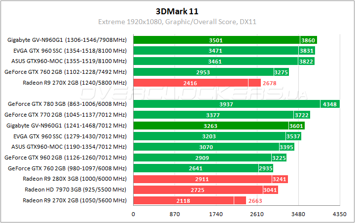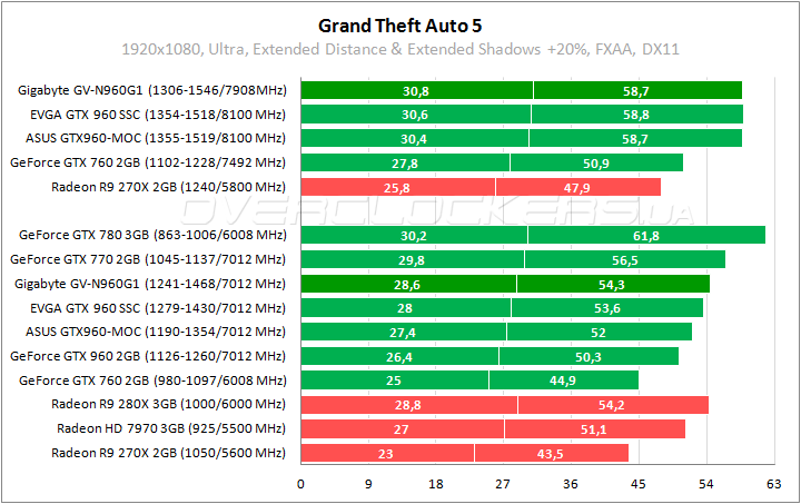 Заводские частоты Gigabyte обеспечивают преимущество 12% над референсом и Radeon R9 280X при отставании около 3% относительно GeForce GTX 770. Прирост от разгона 7%. Более высокая частота обеспечивает лидерство над другими GeForce GTX 960 при разгоне, хотя и мизерное.