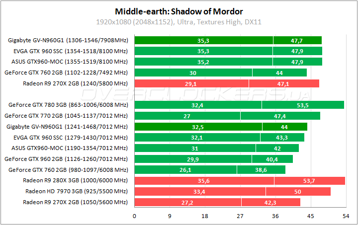 В Middle-earth: Shadow of Mordor у новых GeForce GTX 960 наблюдается серьезное преимущество по минимальному fps над старыми решениями NVIDIA. По этому параметру после повышения частот удается даже обогнать Radeon HD 7970. Весьма показательно, учитывая серьезные требования игры к объему видеопамяти.