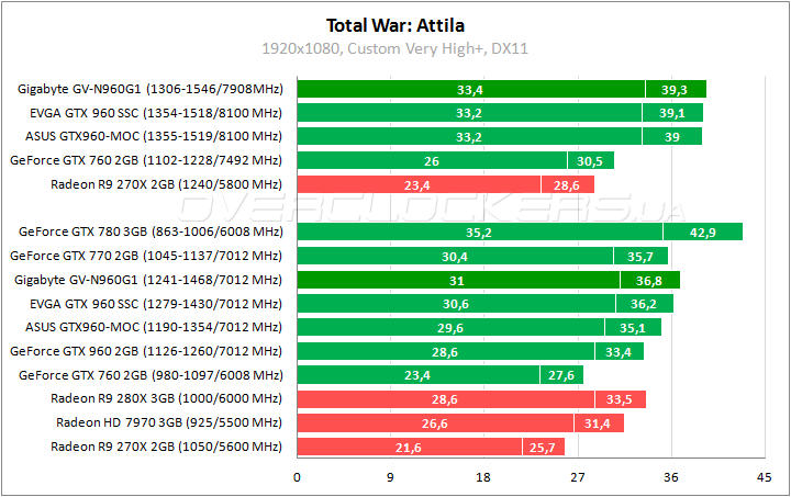 Разница с референсом 8–10% в Attila. Gigabyte при своих начальных частотах производительнее GeForce GTX 770 и Radeon R9 280X. Прирост от разгона 7–8%. Есть небольшое преимущество над остальными форсированными GeForce GTX 960, но оно совсем мизерное.
