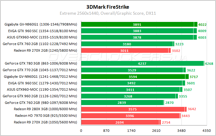Лучшие результаты у Gigabyte на фоне остальных GeForce GTX 960 в номинале и в разгоне. Внушительный отрыв от графических решений AMD. Прирост от разгона 8–9%.