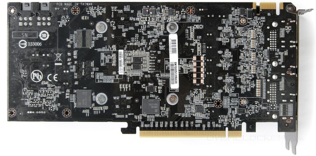 По осмотру задней стороны сразу видно, что PCB выполнена по более сложному дизайну в сравнении со стандартными решениями на короткой плате. Вместо одного разъема питания присутствует два. Сами разъемы развернуты фиксаторами вверх, чтобы радиатор не мешал при подключении кабелей.