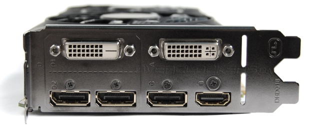 Набор интерфейсных разъемов у Gigabyte таков: два DVI, три DisplayPort и один HDMI.