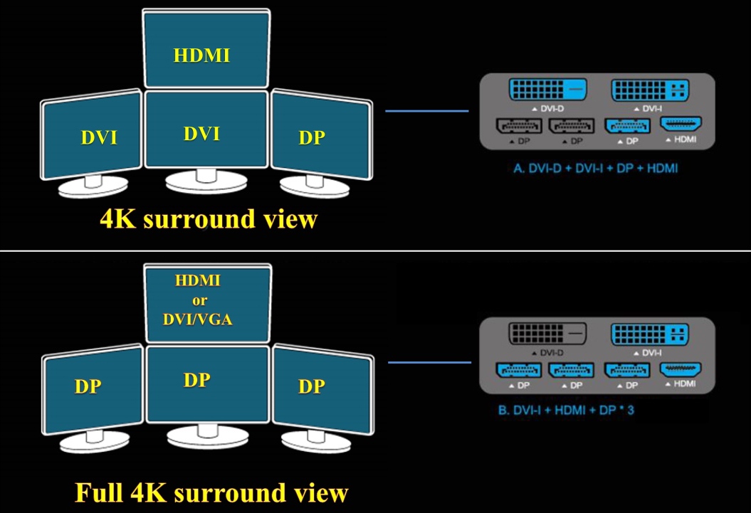 Карта поддерживают технологию Flex Display, предлагающую простое автоопределение и настройку устройств в сложных мультимониторных конфигурациях до четырех дисплеев с разным типом интерфейса. Достаточно подключить их по одной из предложенных схем.
