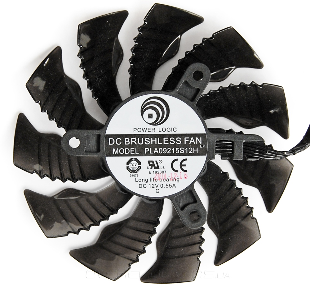 Обдувается вся конструкция парой вентиляторов Power Logic PLA09215S12H диаметром 92 мм. Лопасти имеют особую форму с бороздами на внешней поверхности и дополнительными треугольными «зубцами». Крупные производители в последнее время часто модернизируют форму крыльчатки с целью улучшить рабочие характеристики вентиляторов. Такой дизайн лопастей Gigabyte тоже является следствием подобных экспериментов.