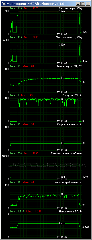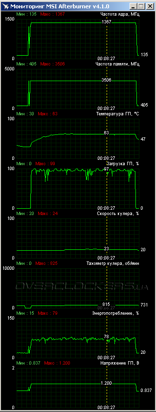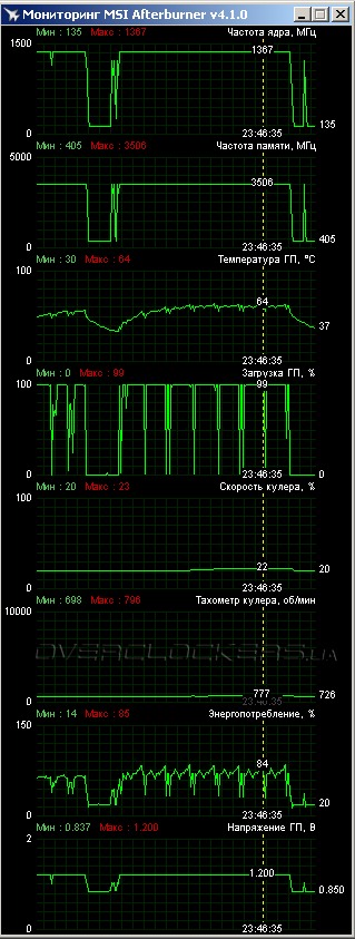 Для 128-битной карты важную роль играет разгон памяти. Тут уже возможности Gigabyte оказались вполне заурядными. Стабильность удалось сохранить при эффективной частоте памяти 7920 МГц. Это ниже результатов MSI Gaming и ASUS Strix, хотя и с минимальной разницей. При помощи ручных настроек скорость вентиляторов была повышена до 1100 об/мин, что даже позволило немного снизить рабочие температуры относительно начальных (ниже скриншот нагрузки в Last Light).