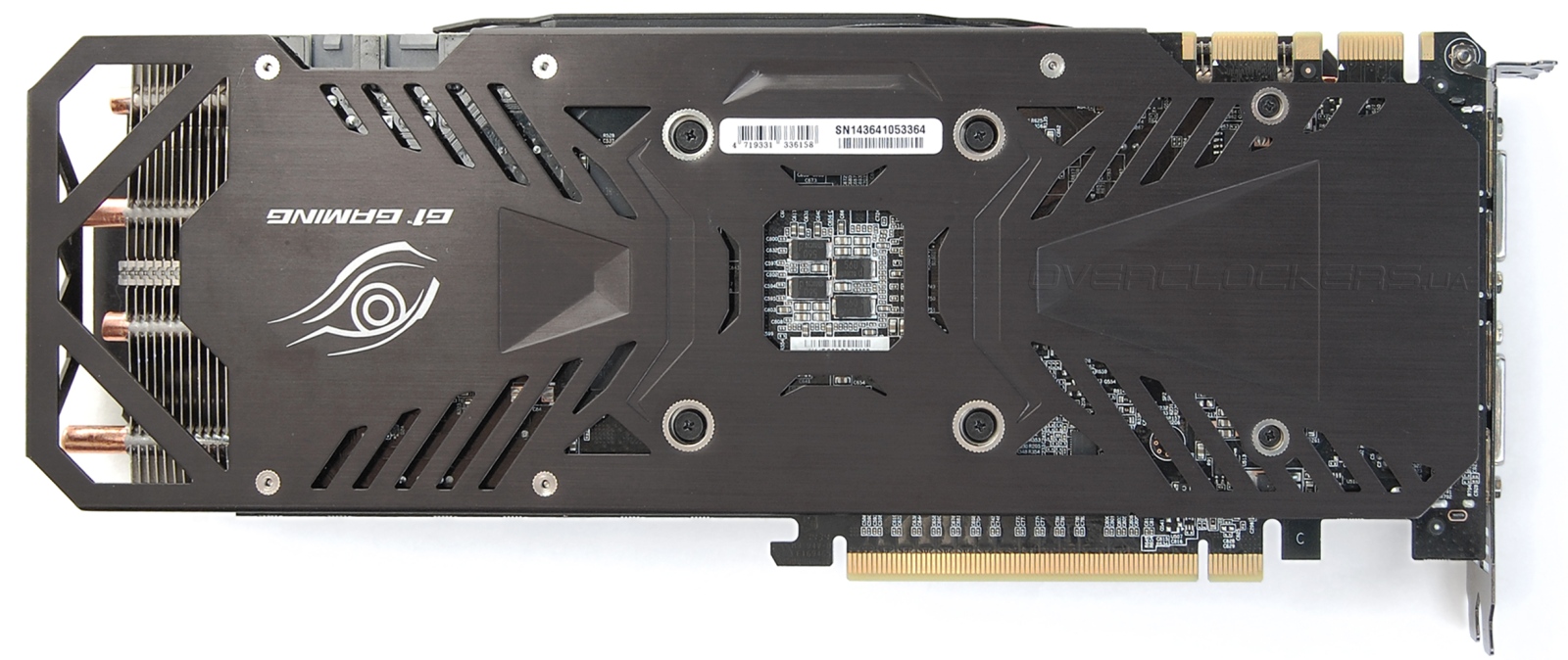 Обратная сторона закрыта металлическим «панцирем» с крупными фигурными прорезями и логотипом G1 Gaming. Видно, что кулер заметно крупнее платы и частично нависает над пустотой.