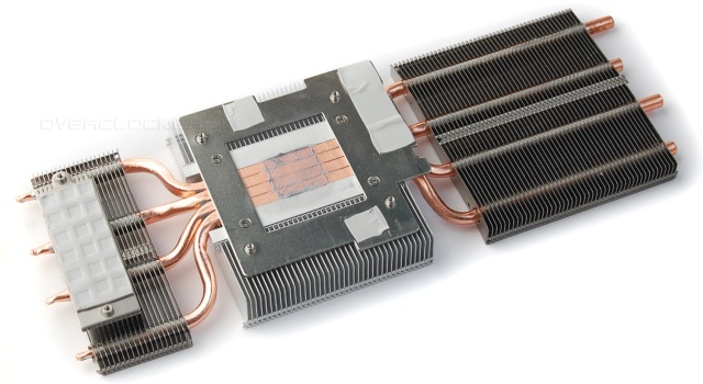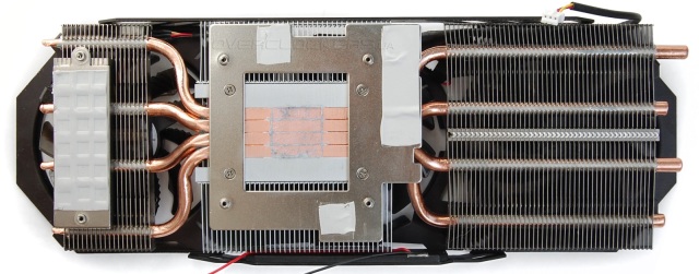 Четыре тепловые трубки подогнаны друг к другу в центральной части и окружены массивным алюминиевым «сердечником». Поверхность трубок напрямую контактирует с поверхностью графического кристалла, при этом общая ширина зоны контакта как раз соответствует размерам GPU, что хорошо видно по отпечатку термопасты. Нет трубок, которые контактируют с кристаллом не полностью или частично. Вокруг зоны контакта с ядром расположена пластина, которая соприкасается с микросхемами памяти.