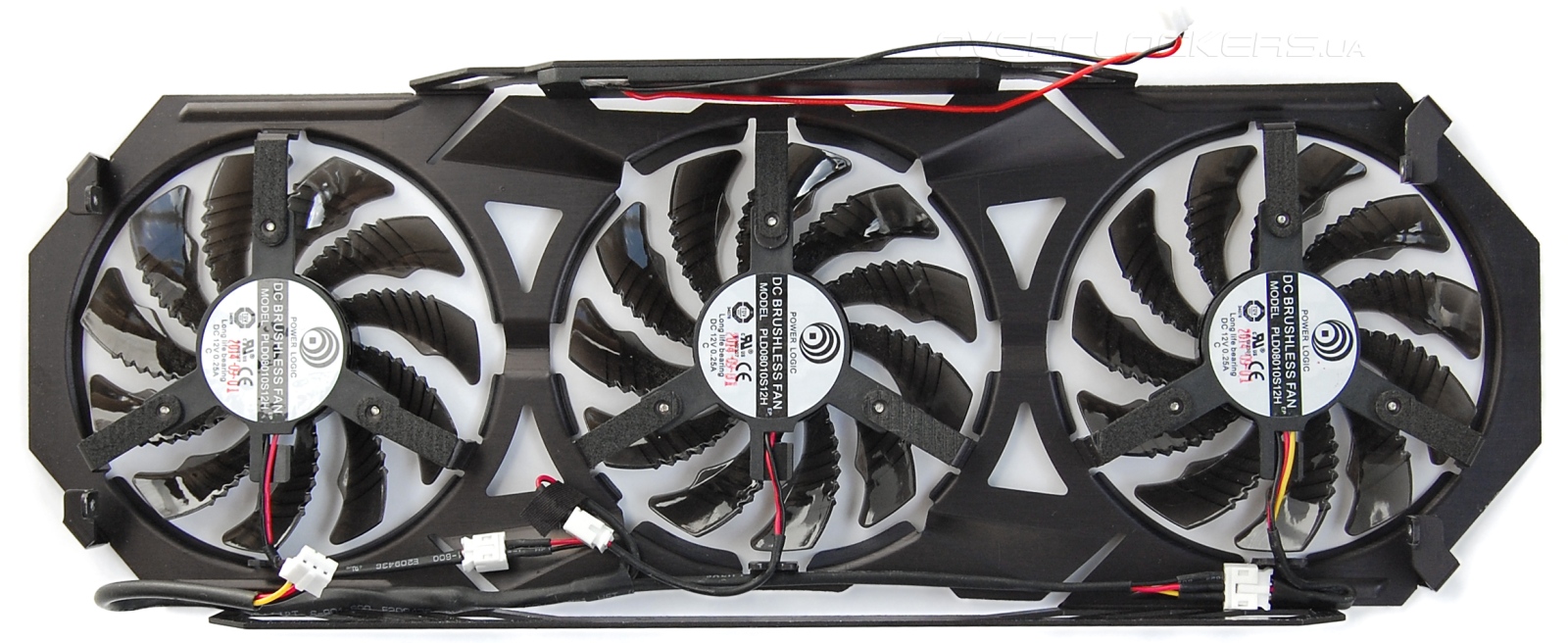Кожух с вентиляторами прикручивается к крайним пластинам радиатора. Используется три вентилятора Power Logic PLD 8010S12H типоразмера 80 мм (крыльчатка 75 мм). Внешняя поверхность лопастей имеет выпуклые борозды и зубец. Этот особый Unique Fan Blade дизайн (сразу вспоминается MSI Propeller Blade) позволяет повысить мощность воздушного потока в сравнении с обычной формой лопастей.