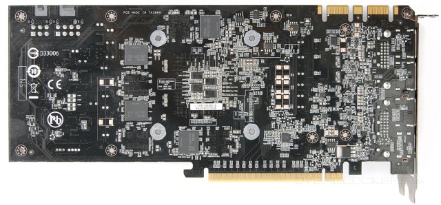 Дизайн PCB нереференсный. Микросхемы памяти распаяны с обоих сторон. Узел питания GPU расположен в левой части.